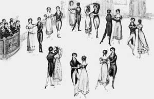 English Country Dancing Before, During, and After Jane Austenby Veronica Ann McClure Some history and background— The first known references to English Country dancing occur during the reign of Elizabeth I. A hundred years later, John Playford published a collection of then new and old country dances in The English Dancing Master — in Puritan London while Oliver Cromwell was the Lord Protector of the Commonwealth of England, Scotland, and Ireland. It was such a success that a second edition was published soon after and a third in 1665, the year of the plague. It continued through many editions well into the 1700s. But it was not alone in the world of dance publications. Whether country dances or court dances, publications continued to come from a variety of dancing masters, often touting the dances for a particular year's season of balls, parties and soirees. Sometimes "country" is equated with "hick" or "rube" or other such terms, but literacy was not common amongst the lower classes. The fact that dance books were so popular indicates that this is dancing for literate persons, i.e., persons of the middle and upper classes. In addition, all of these books espoused dancing with good posture, elegant movement, and specified steps and/or patterns. They require preparation and regulation rather than spontaneous movement, and the dances are arranged to the music, rather than having the music play along until the dancing stops. Country dances are for groups of dancers who trace a variety of spatial patterns on the dance floor. True, the dancers are usually in male-female pairs, but while pairs of dancers are important, they don't have to be mixed-sex couples in order to make it through the spatial pattern. This is an important contrast to dances intended for individual male-female couples. An overview of social dance history in the western world quickly reveals that dances that don't evolve die away or become relics out of the mainstream. Sometimes the waltz is held up as a long-lasting dance because it is now 200 years old. However, the polite waltz of the early 1800s was very different from any of the varieties of waltz now commonly danced, even though it remains a turning dance in 3/4 time for individual couples. English country dancing has also changed through the years. But the essential factors — couples of dancers weaving their way through a variety of spatial patterns — remain, along with the traditional practices of having a lead or first couple, of acknowledging one's partner, and of dancing to the music, not just to a musical accompaniment. Most of the old spatial patterns remain too, even as wonderful new dances are written, sometimes to older music, but also to music that was never thought of two, three or four hundred years ago. In fact, any session of English country dancing today may contain dances from the 1600s to now. The differences give variety to the dance palate while the similarities provide familiarity and identity — a truly lovely combination. Most of the changes in the dance reflect social changes, which is logical given that English country dancing is a form of social dance, i.e., dancing that is for the pleasure and enjoyment of the dancers rather than for an audience. Often there will be a "lump in the snake" as a new idea works its way through a dance community and over time. For instance, in the very early 1800s it became very fashionable among the young and privileged to dance in a way that we today would call balletic — lots of leaps and hops and staying as high on the balls of the feet as possible. In fact, illustrations in dance manuals show dancers "on pointe" but this was an ideal, not an everyday accomplishment. However, time marched on and these teenagers became young adults — which also meant marriage and families. Eventually, some dancing masters proclaimed the fancy steps inappropriate and unnecessary, saying that a light and lively "dance walk" would be just fine. And that has been the norm for English country dancing ever since. (See Barclay Dun, A Translation of Nine of the Most Fashionable Quadrilles … to which are prefixed A Few Observations on the Style, etc. of the Quadrille, the English Country Dance and the Scotch Reel, Edinburgh, 1818.)