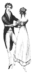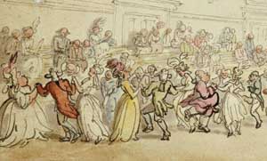 Some particulars about dancing in Jane Austen's time and novels— An important change during Jane Austen's time was the increasing popularity of large assemblies instead of smaller private parties. This meant that the line of couples for each dance could be very long. The first couple, often the first lady, would choose a dance but since there was no public address system, there was no way to tell everyone in the big hall what the dance was and remind them of the sequence. Therefore the first lady would call out the figures of the dance to her nearest neighbors in the line and then the first couple would dance the sequence with them while the next dancers in line watched diligently so they would know the sequence when the lead couple got to them. In this way, the whole line was gradually brought into the dancing. The couples near the bottom of the line — sometimes called the "set" — could have a very long wait before the lead couple got them into the action. This long wait made a pleasant and appealing partner highly desirable to both the men and the women. In Northanger Abbey, Catherine attends the assemblies on Monday and is rather monopolized by the boorish Mr. Thorpe. Thus when she returns to the ballroom on Thursday her "agony began: she fidgeted about if John Thorpe came towards her, hid herself as much as possible from his view, and when he spoke to her pretended not to hear him." Dancing — or waiting for the dance — was also a notable opportunity for young persons to converse without a chaperone nearby. This created a dilemma, as partners who were good conversationalists were prized, even though dancing manuals said to be quiet and pay attention so that you will be ready to dance when the time comes. Because the assembly rooms supported long lines of dancers, those who joined the set stood in their lines until they were brought into the dancing by the lead couple. This is why in the Austen novels the phrase "stand up" implies dancing, as when Mr. Thorpe pressures Catherine about dancing with him and says "And here have I been telling all my acquaintance that I was going to dance with the prettiest girl in the room; and when they see you standing up with somebody else, they will quiz me famously." These factors are brought together when Catherine responds to Mr. Tilney's comparison of a country dance to marriage by saying "People that marry can never part, but must go and keep house together" while "People that dance, only stand opposite each other in a long room for half an hour." Although Jane Austen very much enjoyed country dancing herself, she only mentions one dance by title, a less typical dance called La Boulangere for a circle of couples. Many of today's English country dancers dearly wished she had named some of her favorites. Nevertheless, her letters and stories have dance references and dance scenes, and are an excellent example of richly interwoven factors of movement, clothing, mores and manners, literature, music, and more that make social dance history fascinating as well as a wonderful platform for searching out information in many directions and bringing it all back together. For more information—There are many ways of learning about dance in the Regency era, but one has to start somewhere in particular. Three easy-to-access sources of information are: