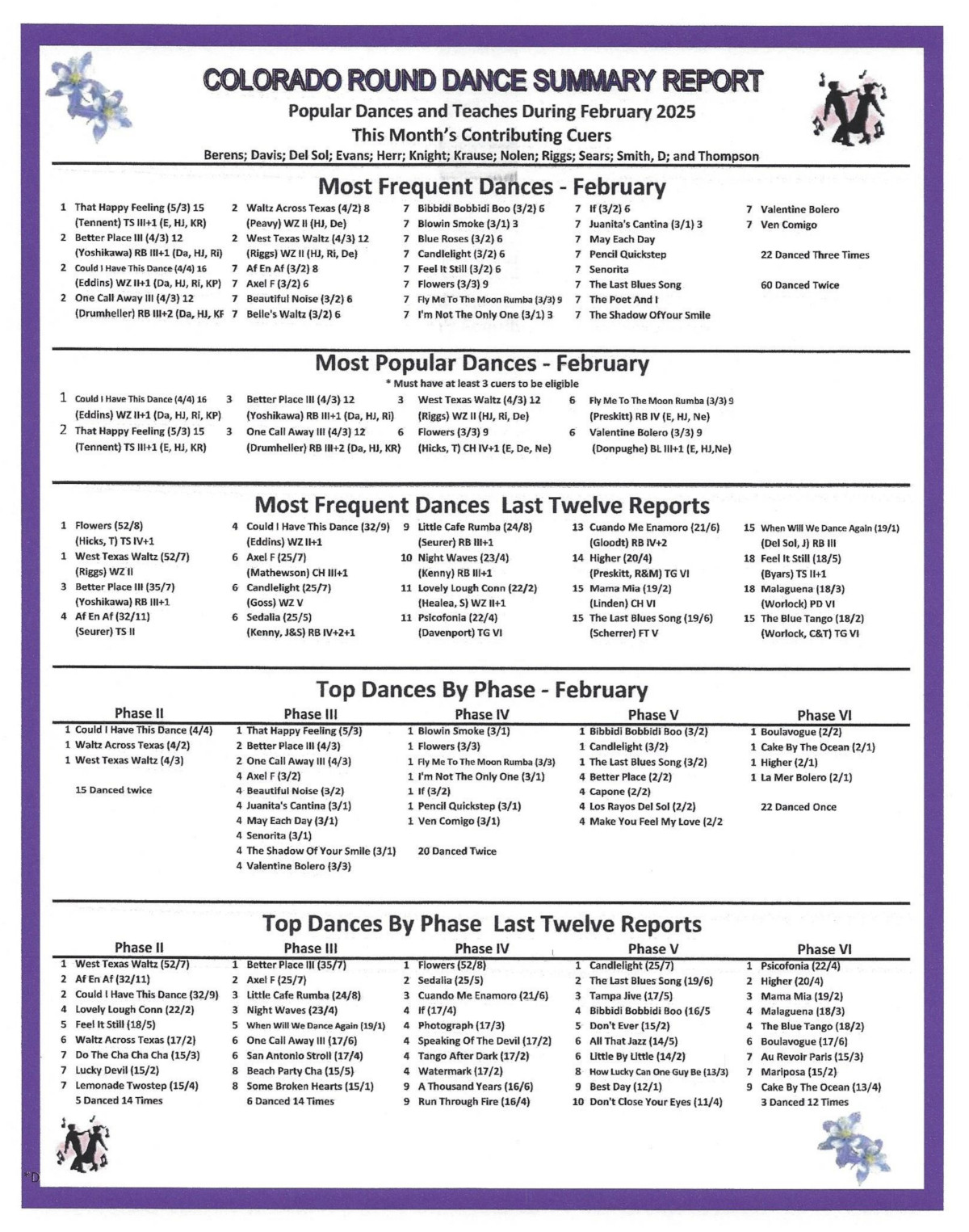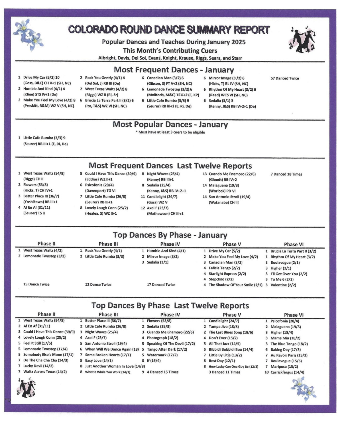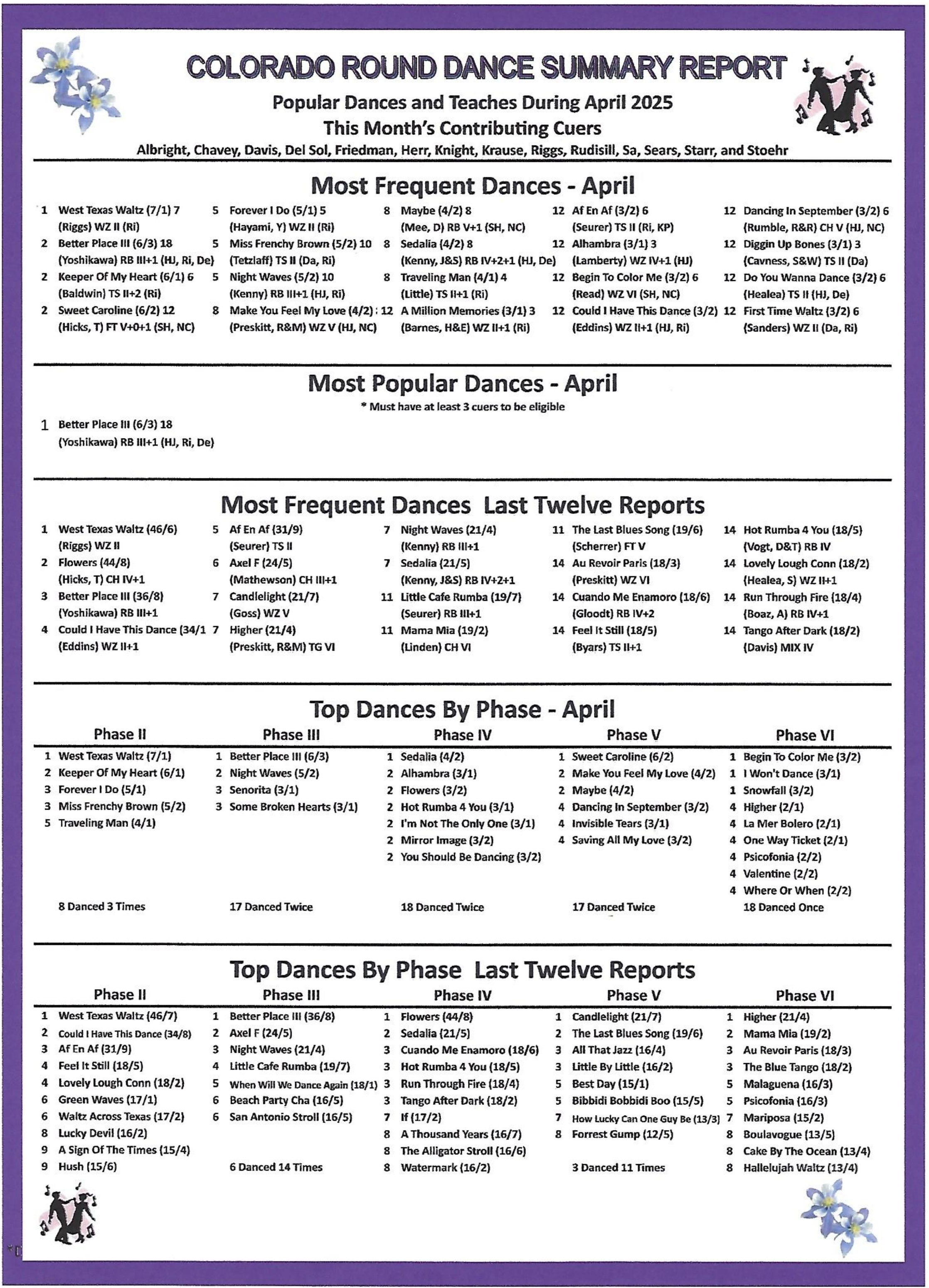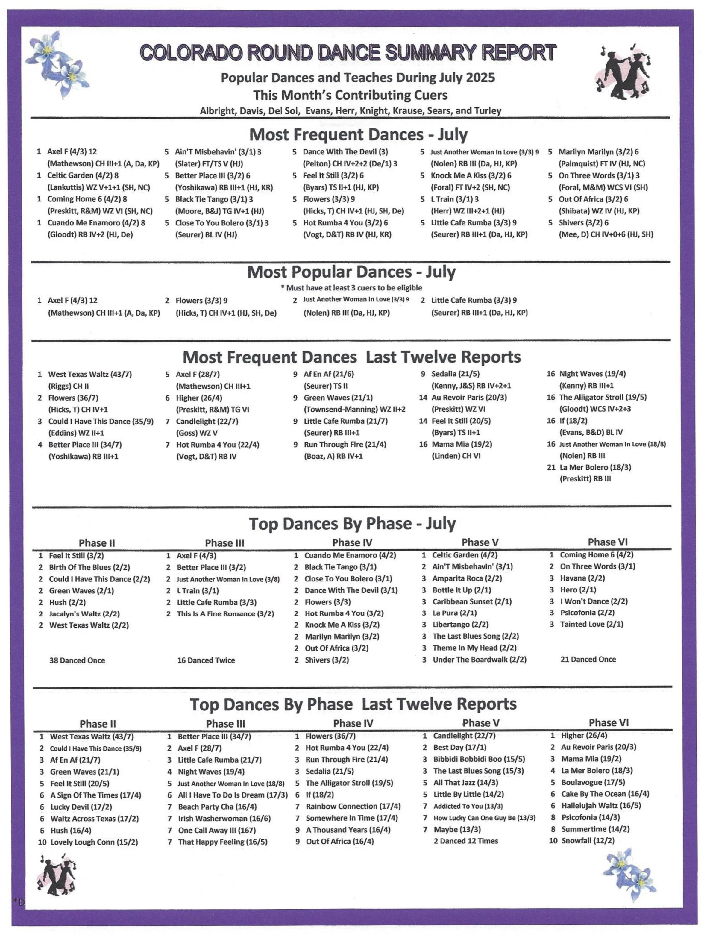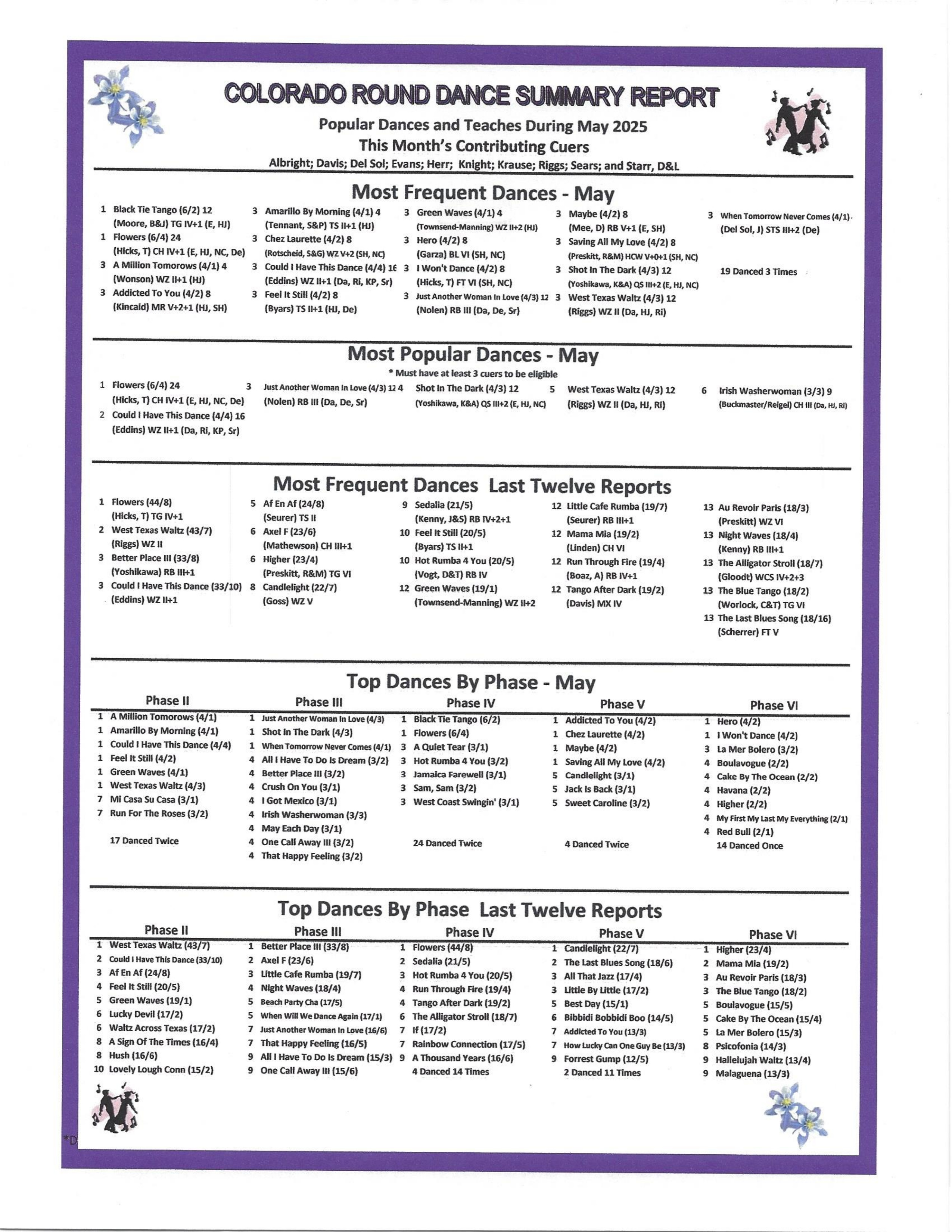 The cue sheets for the new dances presented at the Gala are available here. Scroll through the Schedule to find them all.